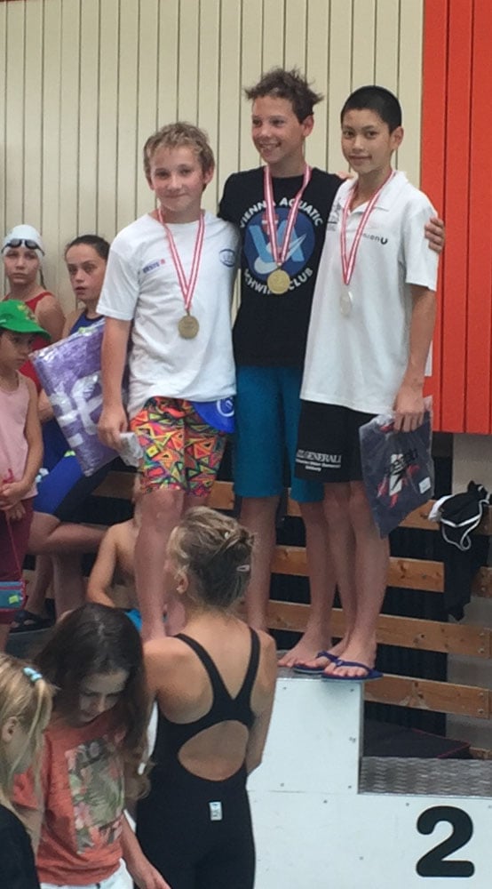 17/100 Sekunden haben Moritz Baumgartner vom perfekten Wochenende getrennt. 16 Starts, unglaubliche 15 Siege und nur über 100m Brust musste er sich um die genannten 17/100 geschlagen und mit dem 2.Platz zufrieden geben. Eine unglaubliche Leistung, gekrönt auch mit dem neuen Wiener Schüler 2 Rekord über 100m Rücken. Zum drüberstreuen auch noch ein Rekord mit der 4x50m Freistilstaffel, gemeinsam mit seinem Bruder Lukas, Dario Ruben Preminger und Timo Cristoforetti.