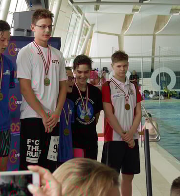 Magdalena Mayer konnte persönliche Bestzeiten in 100m Brust und 200m Brust erzielen. In den 200m Delphin ging sie auf Angriff auf Gold in wunderschöner Technik und war nur leider auf der ersten 50m Meter einen Tick zu schnell angegangen, mußte dann auf den letzten 50m den Tribut dafür zahlen, um sich die erwünschte Medaille zu erobern. Wir sind davon überzeugt: Das nächste Mal klappt das sicher! :-)